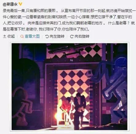 录影现场,小S直言除了老公和亲人之外,这辈子最爱的男人就是蔡康永,而蔡康永也露出笑容回应:“你是我唯一的女人。”蔡康永在访谈中哽咽表示,节目停播并不是自己的本意。蔡康永说,原本以为请辞节目后小S会找人另外搭挡主持,没想到好友也跟着放下主持棒。
