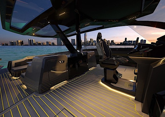 游艇的硬顶设计与兰博基尼敞篷跑车相同,这一设计的目的是最大程度地减少乘员暴露在阳光和海风中,同时确保游艇具有最佳的空气动力学性能。