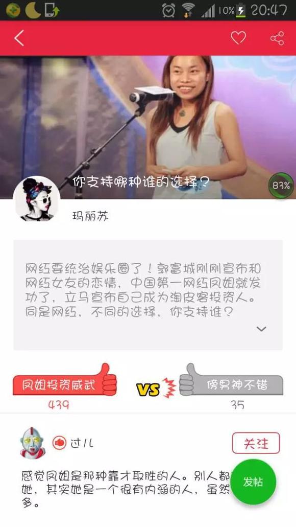 小娱看到,淘皮客围绕凤姐成为天使投资人的消息做了新一期的话题,“同为网红,凤姐当投资人,嫩模傍男人。”用户通过选择支持者,来参与话题辩论。投资人凤姐,摇身一变,又成了APP的话题素材。