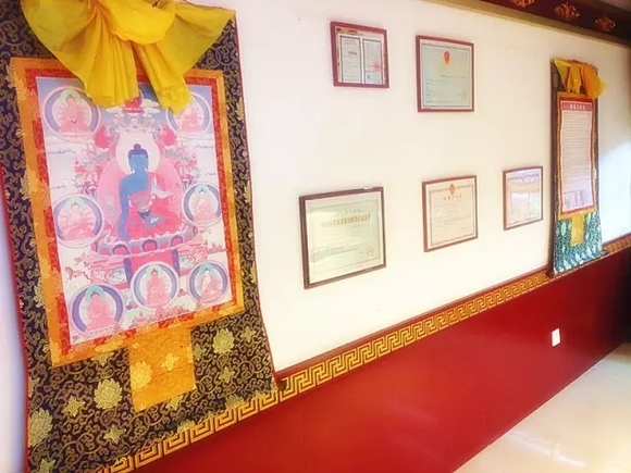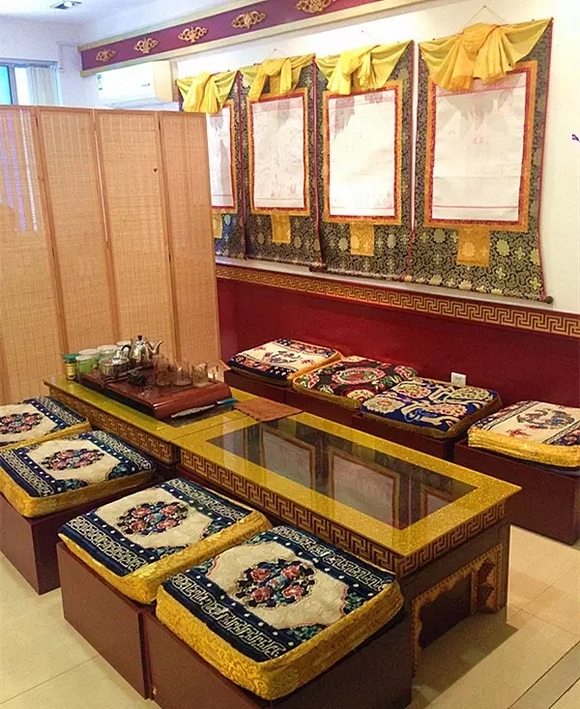 因为在藏族人民看来,黄色代表着大地,红色就代表着火焰,而白色就代表人们纯洁的心灵。墙上挂着写有藏文并印着极具藏文化图案的布艺挂毯,夹杂檀香、琥珀、诃子等天然藏药材秘制而成的藏香扑鼻而来,给人一种庄重虔诚之感。