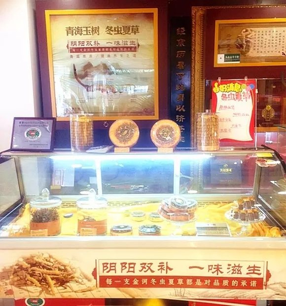 位于药店大门的左手边,是今年金诃堂主推的冬虫夏草专柜。据王宏超介绍,冬虫夏草的产地均来自平均海拔4600米,年平均温度5℃,矿物质含量丰富的碱性土壤的青海省玉树地区。虫体大、饱满,比重超出其他产地的20%~30%,有效成分高出30%左右。