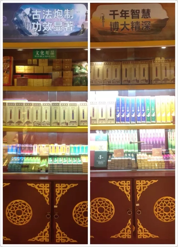 普药销售区的后方有两排立式货柜,摆放着采用经典藏香组方特制而成的班智达藏香,包括保健香、古香、极品供香、盘香、香囊(香包)、便携药香和四季养生等7大系列。据店员介绍,每年都会有特定的顾客大批量购买这些藏香(包括港澳地区),有时候客单可在十万元以上。