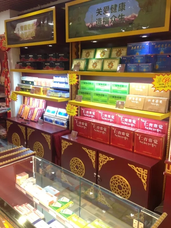 门店左排普药货架后的立式货柜上,清一色全是藏药产品。除了金诃四大珍宝藏药仁青常觉、七十味珍珠丸、坐珠达西和仁青芒觉外,还包括肠胃类、心脑血管类、肝胆类、风湿类、呼吸系统类、妇科类、皮肤类、补肾类、肛肠类和泌尿系统类藏药品类。这类藏药是药店销量的主要贡献力。