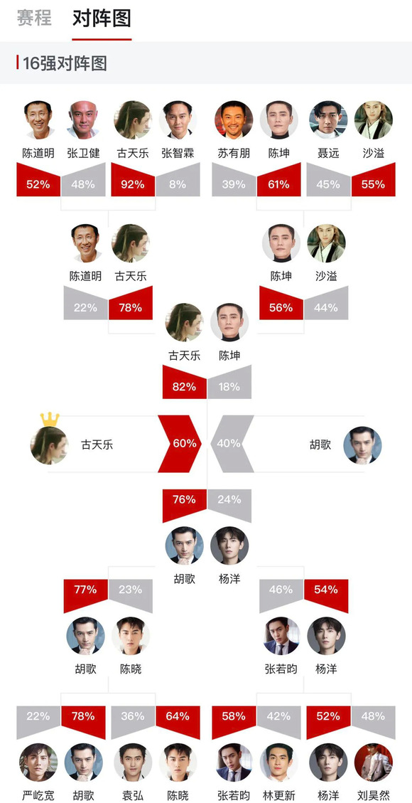天王山之战,在古天乐和胡歌间展开。前者按从无败绩的惯性,直接杀入决赛。后者也啃下了严屹宽、陈晓、杨洋这几块硬骨头。这场比拼,最终以古天乐60%得票胜出。