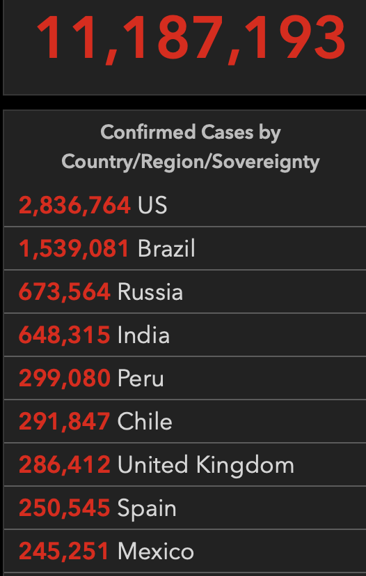 美国约翰斯·霍普金斯大学发布的实时统计数据显示,截至北京时间7月5日7点,全球累计确诊新冠肺炎病例11187193例,累计死亡528364例。