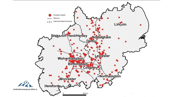 英国中部地区航空产业分布图,红点代表航空航天企业;信息来源:Midlands Aerospace Alliance