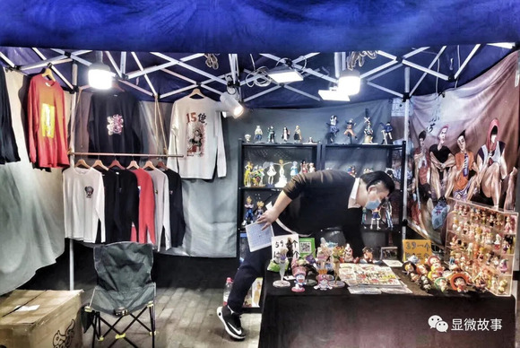 我们一共四个摊位,加上之前负责线上运营的小伙伴,一起在摊位上销售一些二次元手伴、现场打印的T恤、时尚潮牌服饰。
