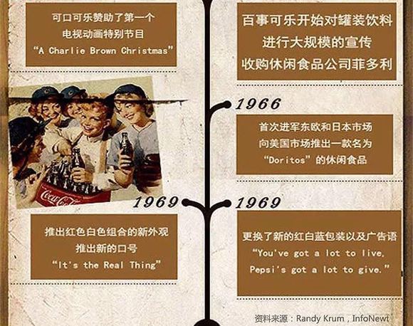 在这场旷日持久而又剑拔弩张的争夺中,两家公司都收获了大量忠诚的拥护者和粉丝,并且坚信自己的地位至高无上。以下信息图表简单勾勒了这场“可乐大战”的大致面貌。