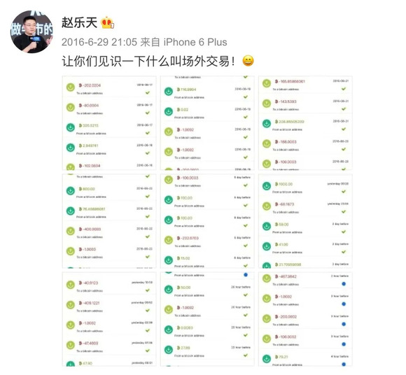 他晒出的场外交易记录显示,他经手的交易中,既有800个比特币的大单,也有0.02比特币的小单。