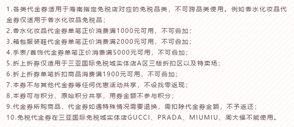 2、这次的套票里还包含免税购物券,购买产品之后可获得2880元中南海四店免税代金券以及额外100元三亚免税实体店购物券。是不是有种飞一趟去购物都赚回本的错觉。但过往的理智和经验告诉我:购物券一般都不简单。请看下方使用明细。