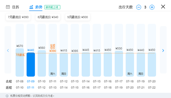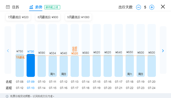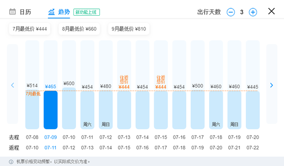 从价格走势来看,7月份是机票的价格低洼月份,这个时候出行无疑是较优惠的选择,虽然8,9月的票价有逐渐上升的趋势,但相比较于亿年不打折的铁路来说还是挺划算的。