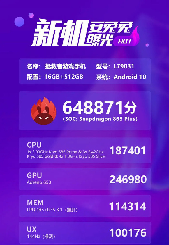 与此同时,安兔兔也公布了拯救者电竞手机的跑分数据,总成绩接近65万分。安兔兔跑分数据图显示,这款手机的型号为L79031,运行了Android 10系统,内存规格是16GB+512GB,CPU和GPU的介绍也与高通骁龙865 Plus相吻合。