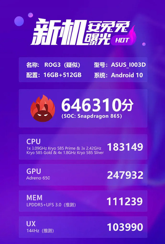 安兔兔同样公布了ROG Phone 3的跑分数据。我们可以看到,这款手机的总成绩仅次于联想拯救者电竞手机,得分646310。按照安兔兔的说法,两款手机的差别在于ROG Phone 3采用的是UFS 3.0,而拯救者电竞手机则是UFS3.1。其他配置两者感觉差不多。