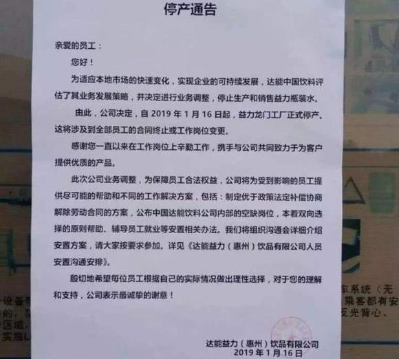 2019年1月,网上开始流出一张关于益力龙门工厂正式停产的公告,随后官方对此表示了确认。于是,在中国市场奔跑了30年的益力瓶装水全面停止生产和销售。