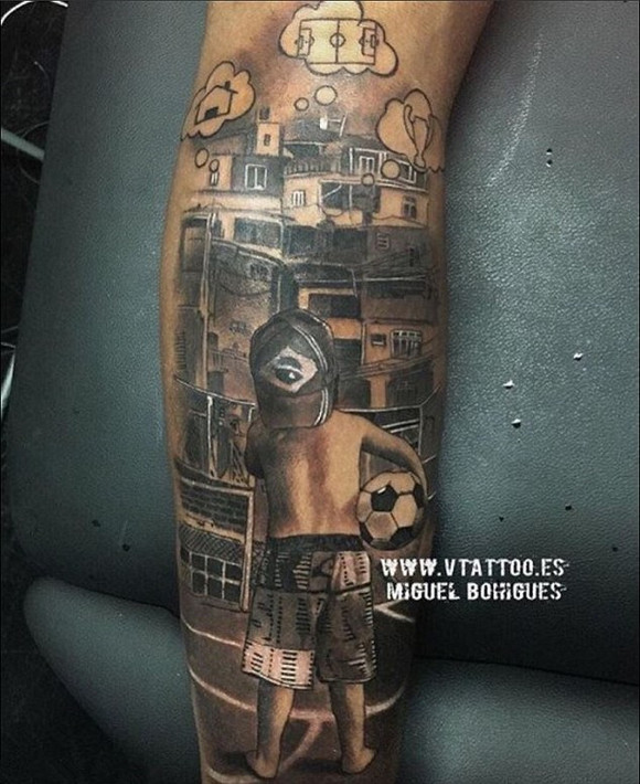 纹身新作看来像是儿时的内马尔在看着一座城镇——很可能是他出生的摩基达斯克鲁易斯市,那时的他梦想着成为足球运动员,想要一个新房子,还想拿下欧冠联赛的奖杯。