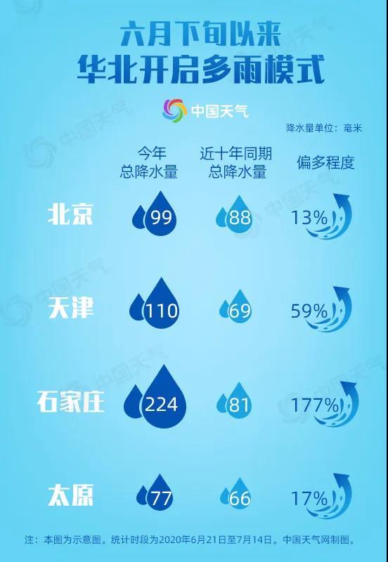 自6月下旬以来,华北地区雨水频繁,北京、石家庄等地都体验了一把“凉夏”。预计,7月20日之后北方进入主汛期,未来一段时间,华北中部、东北部和南部雨水仍偏多。