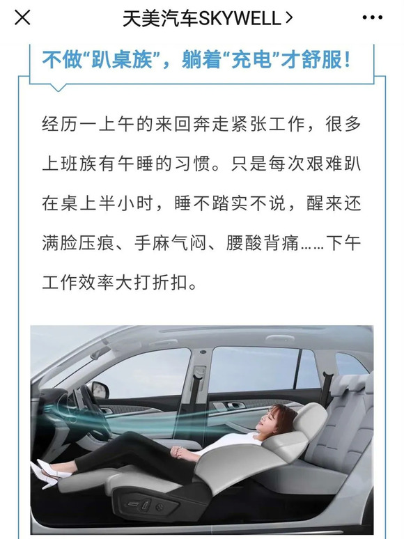 其首款汽车——天美ET5,对标威马EX5和小鹏G3,在车型外观、续航里程、价格定位等方面与前两者都无太大差异,其最独特之处在于搭载的全球首创健康午休睡眠系统。
