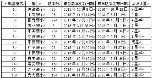 下表的“手机银行”排行榜是根据苹果手机App Store所出示的各家手机银行根据用户在该系统的下载数量而给出的排名,系统评星则是根据用户评价打分给出的综合评价。