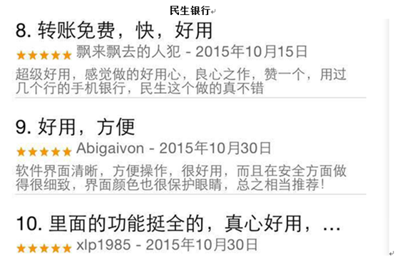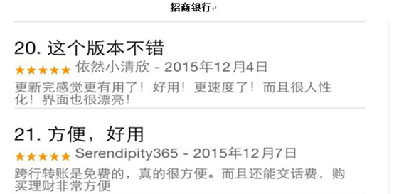 得分最高的招商银行和民生银行的用户评论界面,如同他们的“星级成绩”一样漂亮,好评如潮。