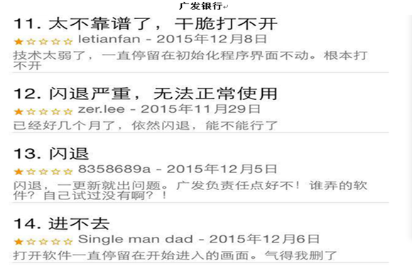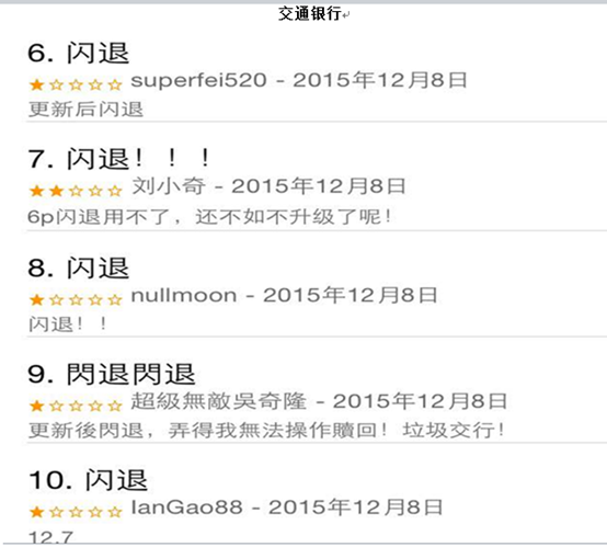 在反馈中,系统面临的最大问题是“闪退”,存在这个问题的银行还不在少数,广发银行和交通银行的问题最为严重,看看他们的用户评论页面,用户的“愤怒“之情爆棚,银行是不是该多用点心思在系统测评和维护上了?