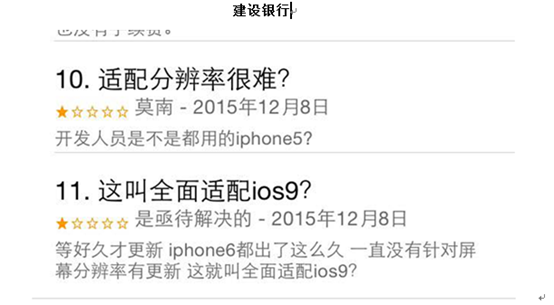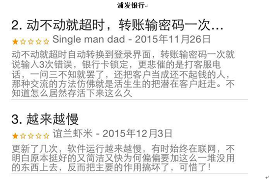 作为中国五大行的建设银行、工商银行、农业银行、中国银行的手机银行下载率在排行榜前五名中占据四席,但评分星级却不高,仅有2星,强大的客户群给了“量”,银行本身推出的手机银行系统却没有给出“质”的回报;一向在“零售”方面做得较好的招商银行和民生银行在用户评价方面得分最高,四星以上,甩开其他银行一大截。让我们来看看苹果手机App Store用户下载后的评论内容,他们那些“给分”理由。