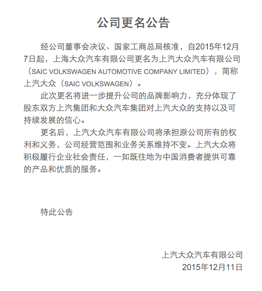 该公司在声明中称,本次更名旨在提升企业的品牌影响力,更名后上汽大众汽车有限公司的经营范围和业务关系维持不变。
