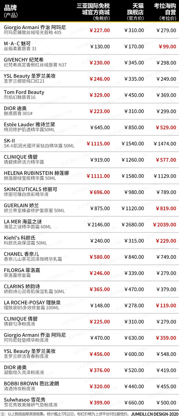 对此,聚美丽随机挑选了包括口红、精华、面霜、粉底液四大品类下的24款产品,同时段对比三亚国际免税城官方商城(以下简称离岛免税官网)与相关品牌天猫旗舰店以及考拉海购官方自营店的价格图谱,供行业人士参考。