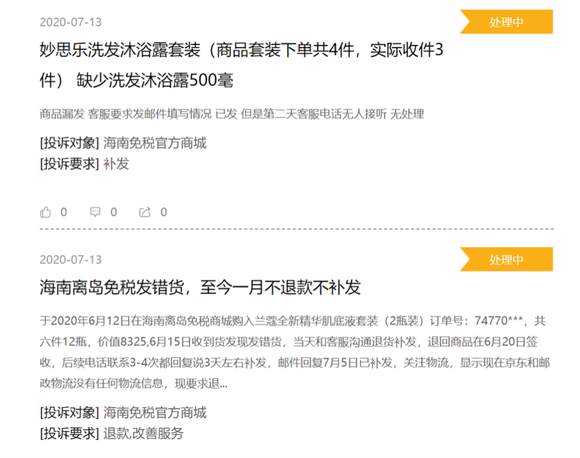 在黑猫投诉平台上,仅7月就有29位消费者因未发货、丢件、未退款等各类原因投诉海南免税官方商城、海口美兰机场免税店线上购物商城等免税店旗下平台。