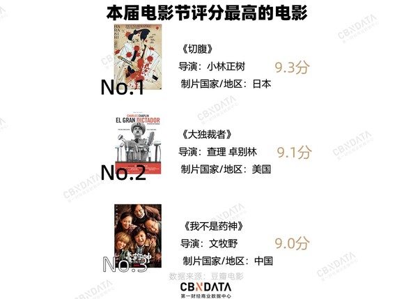今年展映影片中,134部已经有了豆瓣评分,其中8分以上的佳片有48部,评分最高的电影是日本导演小正林树的《切腹》, 24704位豆瓣网友给出了9.3分的评分。