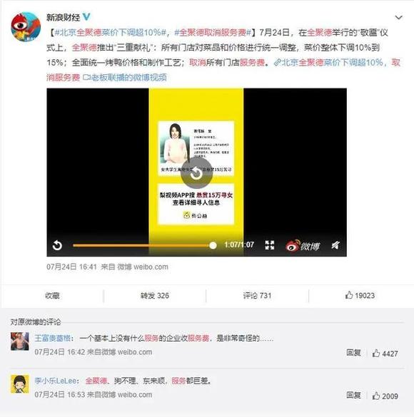 在7月24日的敬匾仪式中,全聚德更是宣布门店菜品菜价整体下调10%至15%,并取消所有门店服务费。