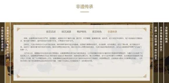 始建于清同治三年的百年老字号全聚德曾一度是北京烤鸭的代名词,其"挂炉烤鸭技艺"还入选了国家非遗传统项目,成为北京乃至中国品牌文化输出的重要产品。