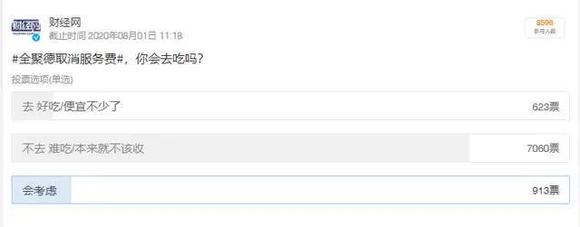 而在全聚德取消服务费后,财经网在微博话题#全聚德取消服务费#下发起了"你会去吃吗"的投票,其结果呈现一边倒的态势。总计逾8500名投票者中,有超过7000人选择了"不去 难吃/本来就不该收",而选"去 好吃/便宜不少了"的人则不超过10%。