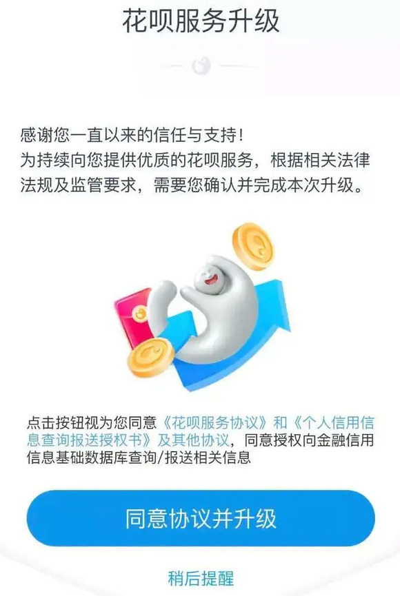 不少支付宝用户表示,从今年6月份开始陆陆续续收到了花呗服务升级的通知,内容显示为:为持续向您提供优质的花呗服务,根据相关法律法规及监管要求,需要确认完成本次升级。其中,征信报送的授权书就在此次升级服务的内容中。