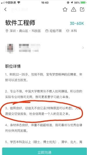 某科技公司直接把征信无不良记录写在了招聘需求中。