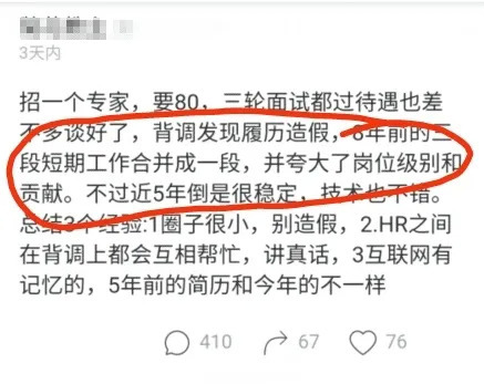 一位HR分享了她的招聘经历称,做背调时发现一位专家的履历造假,“将8年前的三段短期工作合并成了一段,并夸大了岗位级别和贡献。”
