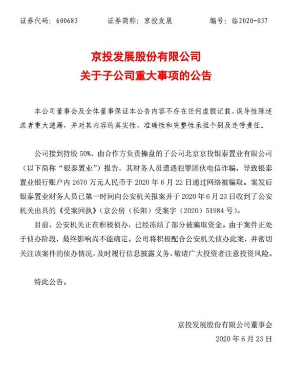 无独有偶,6月23日晚间,京投发展发布公告,称子公司银泰置业的财务人员遭遇犯罪团伙电信诈骗,导致银行账户内2670万被通过网络手段转出。
