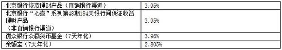 该款理财产品高于余额宝的7天年化收益率2.805%。但是低于微众银行众赢货币基金的3.96%。但是,北京银行的理财产品在流动性远远不及众赢货币基金。众赢货币基金可以随时取现,但是理财产品必须到期才能收回本金和收益,流动性这方面的安排显然不如众赢货币基金。所以,北京银行该款理财产品的收益率一定程度上缺乏了吸引力。