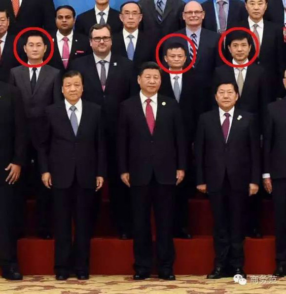 黄金站位,顾名思义就是最好的ACE位(第一排的领导们不在讨论范围),合影正中间、习大大身后的核心位置,很自然地给了互联网三巨头BAT(百度、阿里、腾讯)。