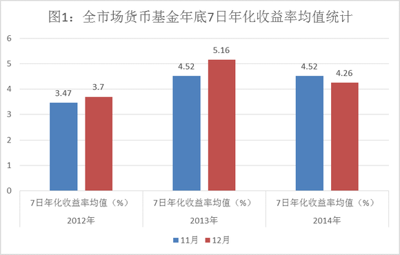 结合图表来看,2012-2013年间,市场上货币基金的年末收益率都有不小幅度的上升。根据WIND数据,2012年11月全市场货币基金的7日年化收益率(%)和万份收益均值(元)分别为3.47和1.16,而到了12月,这两项数据分别上升到了3.70和1.32。