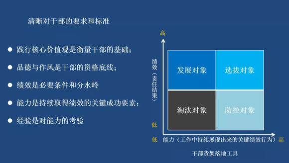 用干部标准通用货架,你今天回去就可以衡量干部。如果你没有更高明的方法,就用这4条去衡量,至少犯不了大错,出不了大的问题。