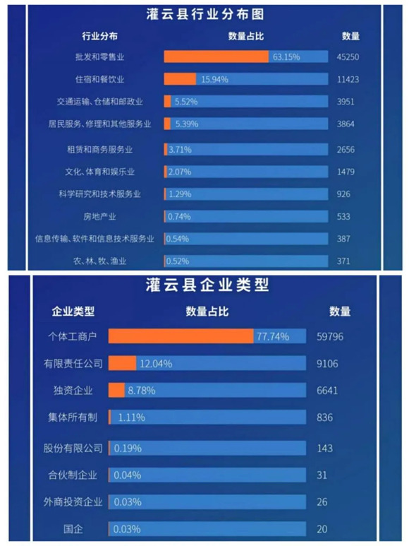 通过企查查大数据显示,截至2019年底,灌云当地的个体工商户达59796家,注册率77.74%,其中批发和零售业以63.15%的份额一骑绝尘,而情趣内衣产业又是整个灌云县的核心,在连云港市位列第一。