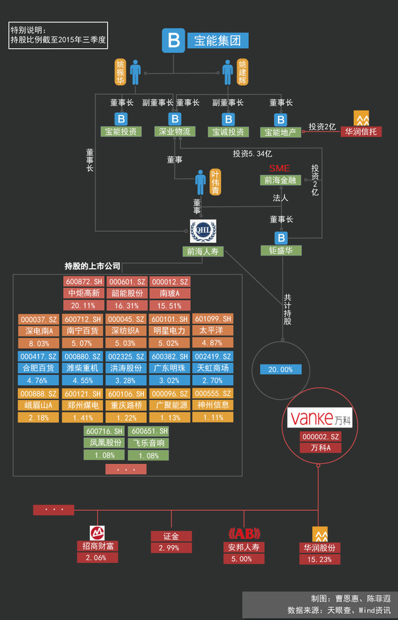 万科原来的第一大股东华润股份目前按兵不动。界面新闻根据天眼查软件发现,华润信托此前还耗资2亿投资了宝能旗下的宝能地产。万科的股权向来分散,除了华润以及宝能系之外,安邦人寿、证金等均在万科占有股份。