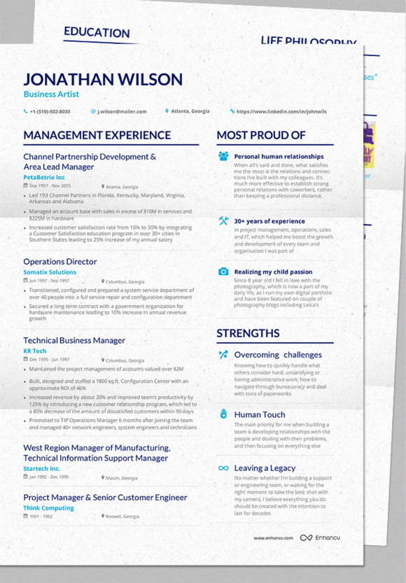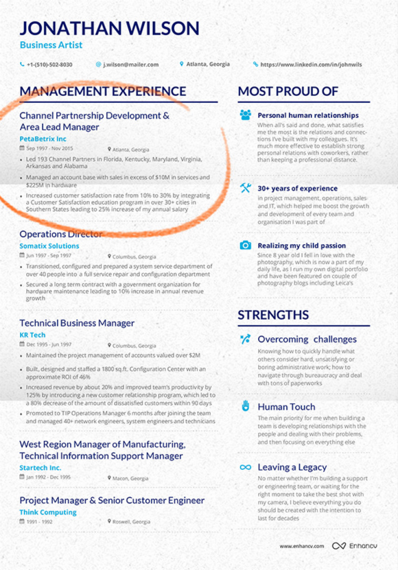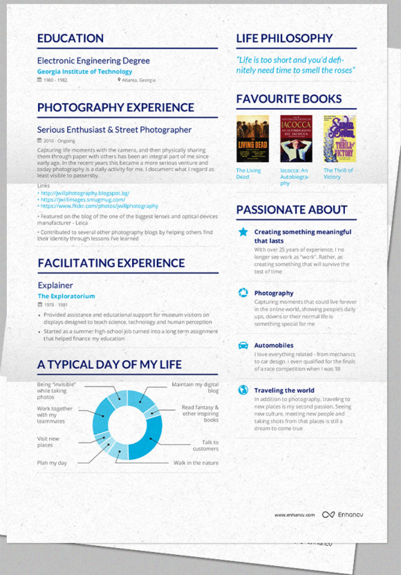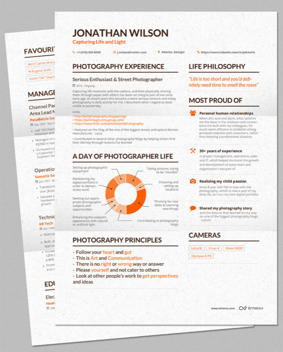 在这个例子中,这个人实际上一直梦想成为一名专业摄影师。因此,Enhancv为他定制了一份针对摄影爱好的求职简历,着力强调他的摄影经历、摄影日程安排、摄影原则及使用的相机设备。若是申请其他公司,这样的简历当然显得他非常不务正业,但若是申请摄影相关的工作,这份简历就很好地展示了他的相关经历与才华。