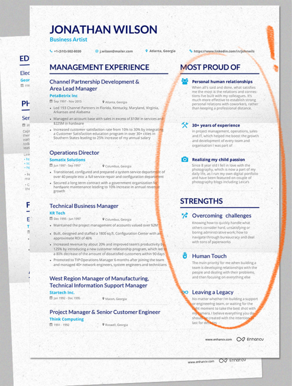 Vulkov指出简历的第二个问题是没有指出这个人的长项、能力以及已经取得的成就。为了解决这个问题,Enhancv删掉了原本的“简介”部分,转而讨论他的人际交往能力、30多年的长期工作经验以及他擅长的领域。