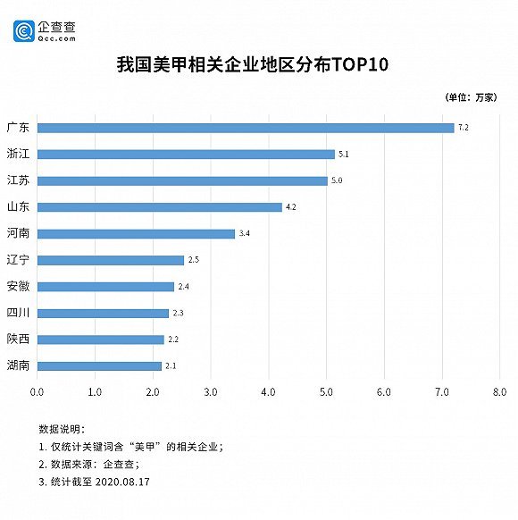 万万没想到,疫情后反弹最大的行业可能是美甲。当口罩遮住了脸蛋,不少女性将目光放在了“女人的第二张脸”——手上,许多美甲店老板表示供不应求,“根本忙不过来”。企查查数据显示,目前我国共有61.71万家美甲相关企业,其中广东省以7.2万家排名第一,浙江、江苏分列二三位。近年来,美甲行业十分火爆,2019年新注册企业达到10.1万家,同比增长52.37%,今年二季度新注册企业4.3万家,同比增长8.4%。