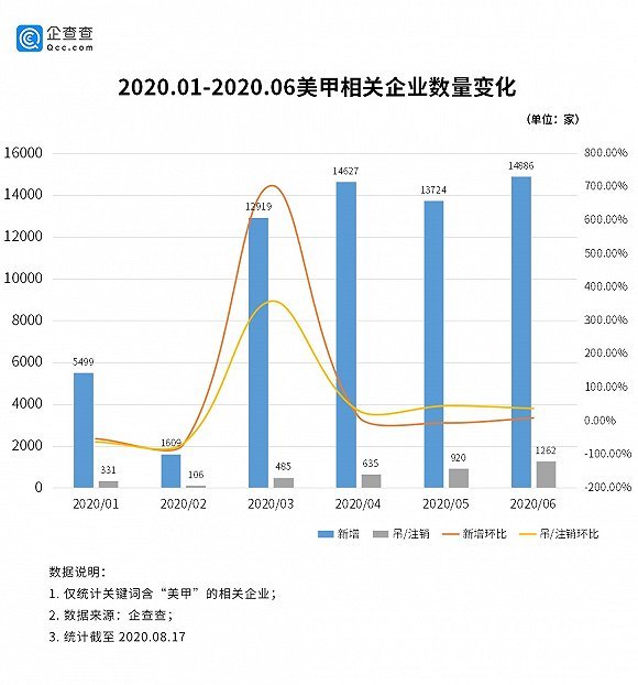 企查查数据显示,今年上半年,我国美甲领域相关的企业新注册6.32万家,同比下降4.2%。其中,因受新冠疫情影响,2月份跌至143家的低谷,3月份以来,美甲市场迅速回暖,连续四个月企业注册量均高于1.2万家,其中6月份注册量最多,当月新增1.48家。二季度共注册相关企业4.3万家,同比增长8.4%。另一方面,企业注吊销量也逐月递增,其中6月份注吊销量达到1262家,环比增长37%。
