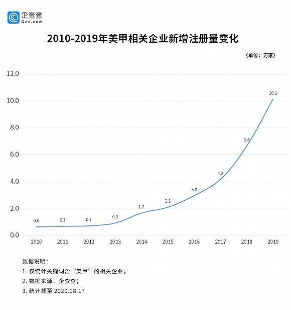 目前我国共有61.71万家美甲相关企业,2019年新注册企业达到10.1万家,同比增长52.37%,今年二季度新注册企业4.3万家,同比增长8.4%。