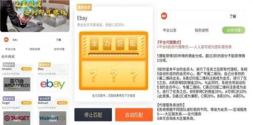 平台共有白银、黄金、铂金、钻石四级会员,分别可针对亚马逊、Ebay、Target和沃尔玛进行每日50、60、65、70次匹配,每次匹配只需轻点自动匹配按钮,即可完成刷单,无需与其他任何客服交流。