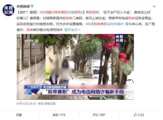 而在今年7月13日,"央视曝光刷单兼职骗局"的话题则冲上了微博热搜,并在短时间内创造了高达2.5亿的阅读量。据了解,今年以来,仅广西南宁警方就抓获电信网络诈骗犯罪嫌疑人647人,其中刷单类诈骗占到南宁市电信网络诈骗案发数总数的21.5%,发案数位居第二。