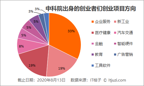从项目方向来看,当前中科院出身的创业者们基本都选择了高精尖科技相关的创业方向。IT 桔子数据显示,这 36 家公司中有 33% 针对 ToB 方向,主要集中在前沿技术包括物联网、人工智能、云计算等;有 1/5 的项目专注于医疗健康和新工业等技术方向,其中不乏当前受到资本关注的药物研发、新材料研发等。